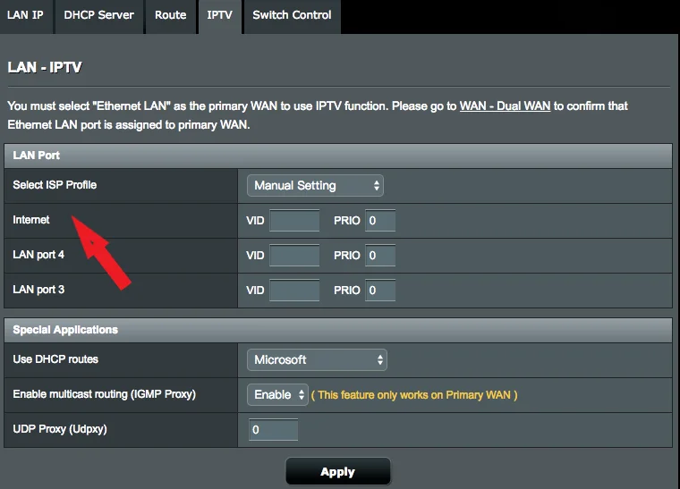 Yes IPTV settings is in the LAN settings. I accessed there and made the following changes as shown in the picture:
