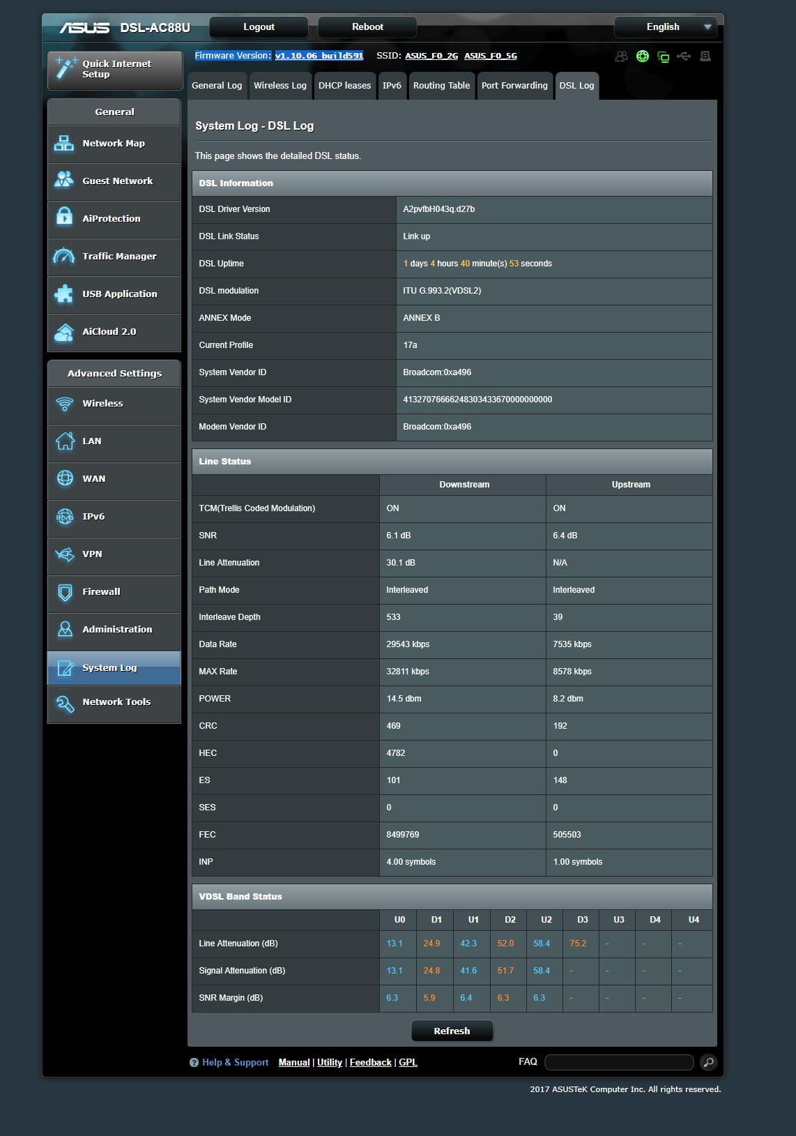 January 18, 2019 at 9:41 pm #2015Hi all, I have problem with my ASUS DSL AC88U my Line Attenuation is 30.1 db and my Data Rate 29543 kbps and SNR 6.0 db on my old DLINK 2888A my Line Attenuation was 16 db and my speed was 59 Mbps and max speed is 75Mbps and SNR 15.9db and if i reconnect DLINK i got this high speed again and if i use ASUS DSL AC88U it get slow after 2 or 3 days but DLINK keep the speed high is this firmware issue or ?? thanks