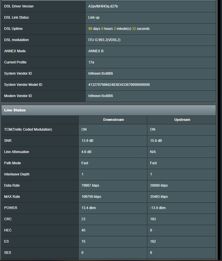 August 8, 2019 at 10:27 pm #3717August 8, 2019 at 11:20 pm #3719I noticed you Attenuation was low (lucky chap) , hence good synch. maybe worth giving your ISP a call and see if they can find any errors with your line ? I have emailed ASUS so will let you know about unlocked Firmware.