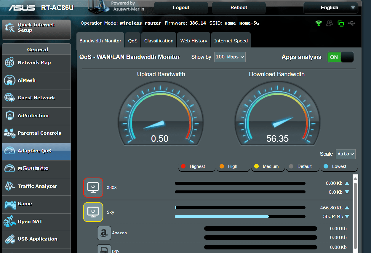 August 14, 2024 at 7:45 pm #33119To see which devices are using bandwidth, go to Adaptive QoS > Bandwidth Monitor and enable Apps Analysis, this will then present you with each device and its bandwidth it is utilising and which services (apps) are eating up the bandwidth.