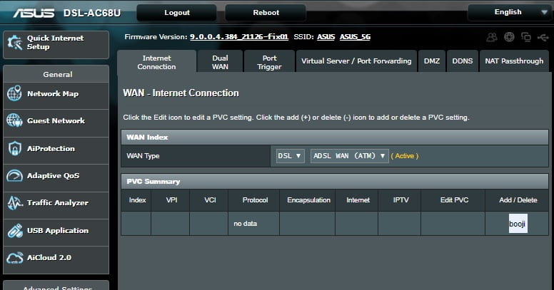 I have uploaded a few pages. These pages are captured after a full Asus firmware tool restore and hard NVreset. As you can see on the WAN/PVC summary page there is a section called “booji” this was a username with previous DSL settings that have somehow survived the cleaning process. Now if I go into the booji setting it shows a VDSL section without a username or password. The ADSL setting (picture not included) has a username and password box. I didn’t notice these pages before since I restored my config from an older version so didn’t spot it. It sort of explain why my router is confused since there’s part of the router settings that hasn’t been cleared out.