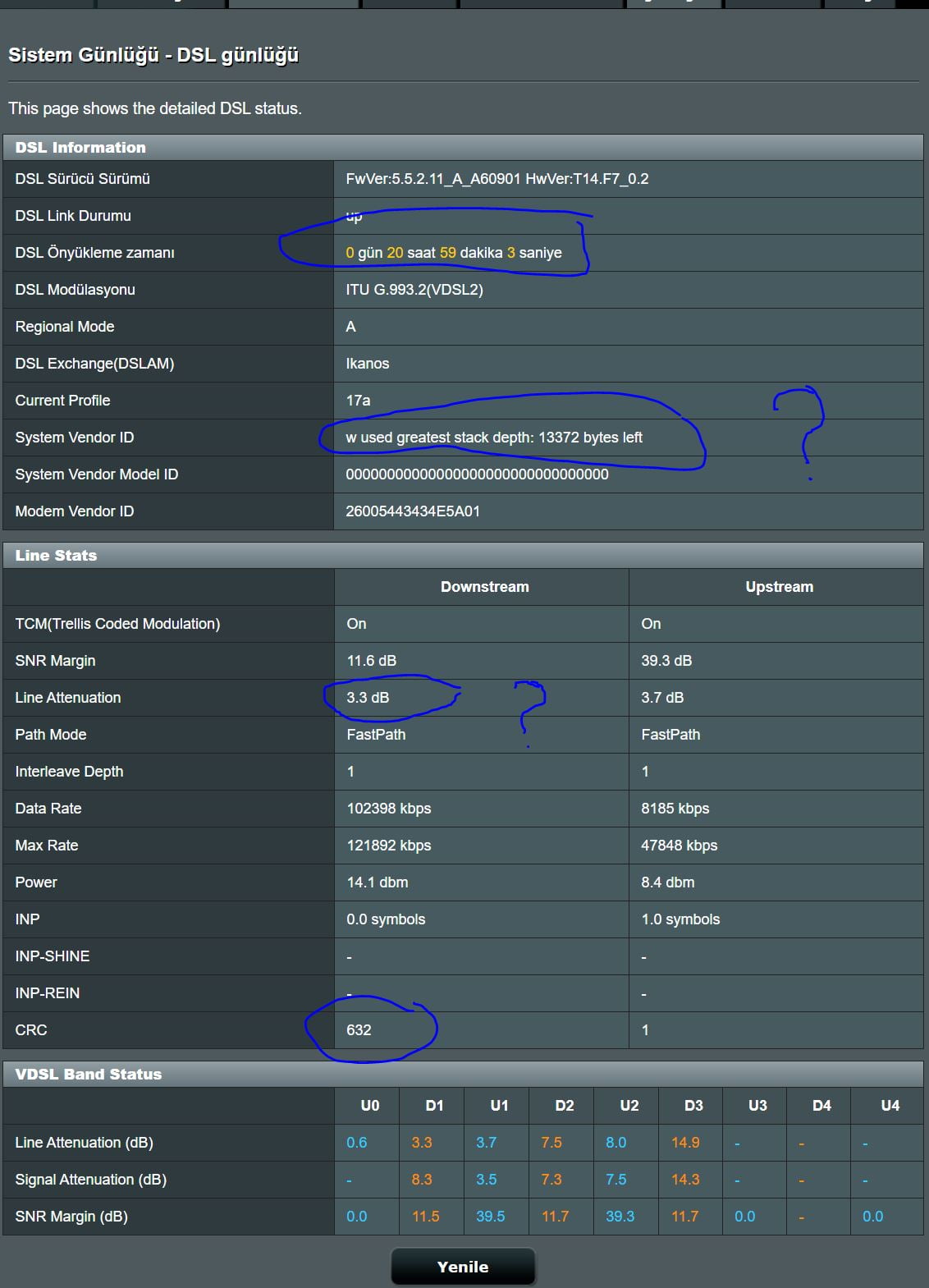 April 25, 2021 at 9:24 am #12962ASUS AC51 I am experiencing breaks with these values in the pictures I have attached, the CRC rises and breaks, I made the recommended settings from the DSL settings, again, these values are normal or the breaks continue, in the meantime, next to our ISP plant building with a cat6 cable ASUS authorizations for Turkish net DSL-AC51_1.1.2.3_473 firmware They said use it by doing and the result did not change. I updated DSL-AC51_1.1.2.3_790 The pictures of two different modem interfaces are attached for now, but the CRC 900 has been added. ASUS modems always have such a problem, stop my problem, it usually bothered me. Line Attenuation values 3.3 very bad or good Also DSL-AC51_v9.1.2.3_928- what is the update that I came across in this forum, is it correct? Is anyone using it for ASUS ac51 thanks