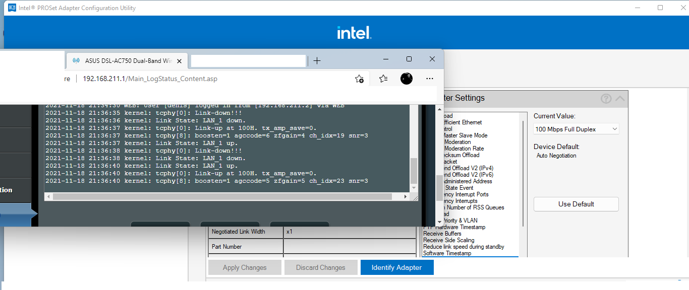 When windows is configured to 100Mbps Full the line get 100H(Half ?). The log seem to say this for configured 100F or 100H from the computer. If i don’t configure it from windows or intel tool and i leave it to auto conf log say 100F.