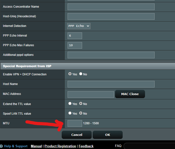 should be under ‘Account Settings’ unless your WAN Connection Type is STATIC, then it will be under Special Requirement from ISP = MTU