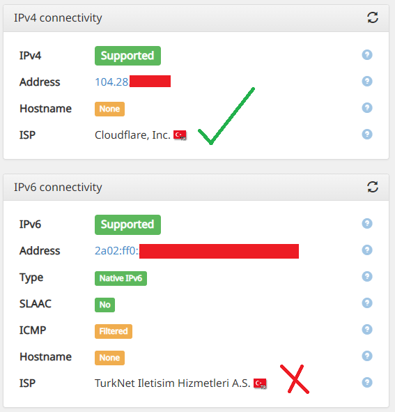The website whatismyipaddress.com is also showing my IPv4 address as the Cloudflare VPN and my IPv6 address as my direct TurkNet address.