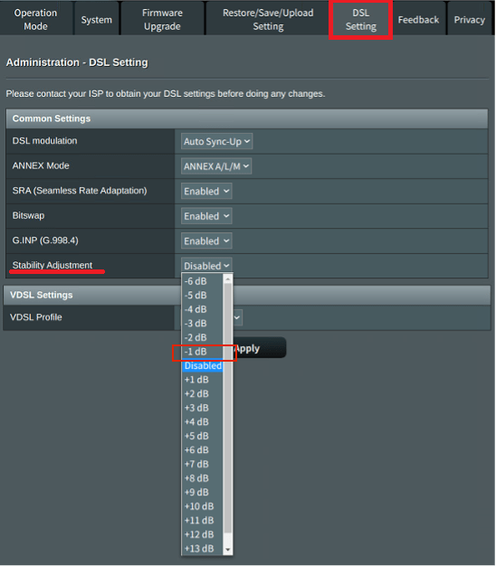 Ok, so spoke with ASUS and they have kindly shared DSL-AX82U beta Firmware (DSL-AX82U_9.0.0.4_386_43563-g9919a0d_cferom_puresqubi) which now the UI of Stability adjustment has changed to -1 dB, -2 dB, … and +1 dB, +2dB etc. and should work for both ADSL and VDSL connections. This is a beta firmware so normal UKTH ASUS beta firmware T&Cs apply (see top of forum) DSL-AX82U_9.0.0.4_386_43563-g9919a0d_cferom_puresqubi.w (5 downloads) Would be good if someone could verify if VDSL Stability adjustment actually works ?