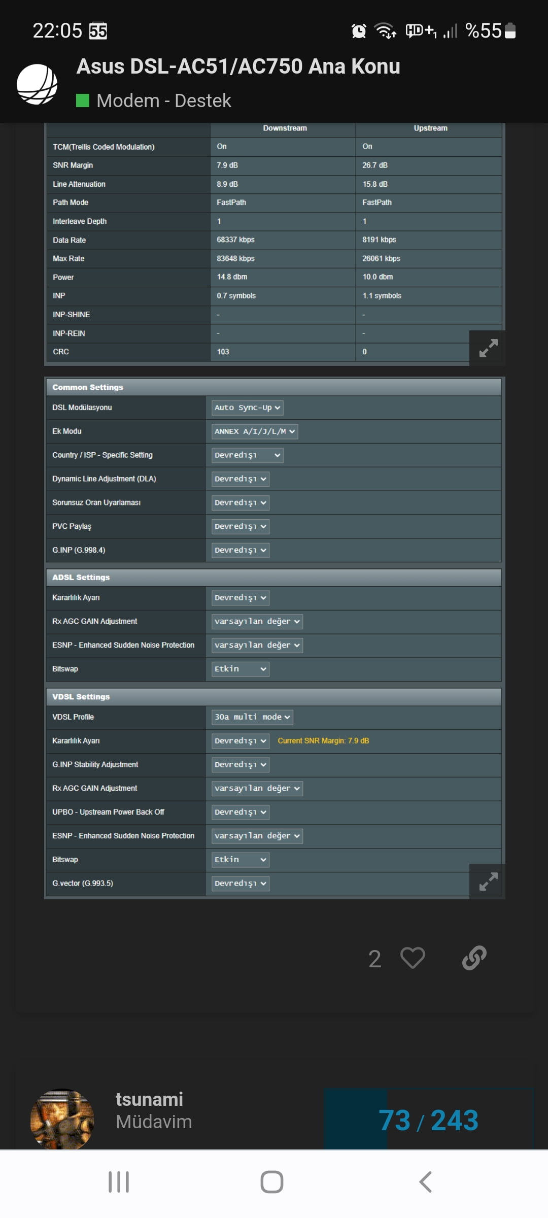 October 18, 2021 at 7:05 am in reply to: Latest Beta Firmwares for DSL-AC51 to DSL-N66U incl. DSL-AC750 Latest DSL ASUSWRT firmware v9.1.2.3_502-g2bdb05b now available. (latest firmware’s are at end of threads) For following ASUS DSL Modem Routers: DSL-AC51 DSL-AC52U DSL-AC55U DSL-AC56U DSL-AC750 DSL-N10-C1 – (extended beta support... #15821I started using the 9.1.2.3_945-g470b0ea version sent by Asus Turkey Customer Service. Crc errors are almost non-existent, but this time the late connection problem is back. In short, I’ve given up on this war :) good luck to everyone